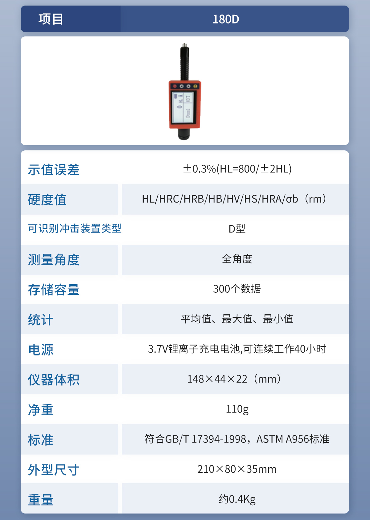 | 标准 | 符合GB/T 17394-1998,ASTM A956标准 |