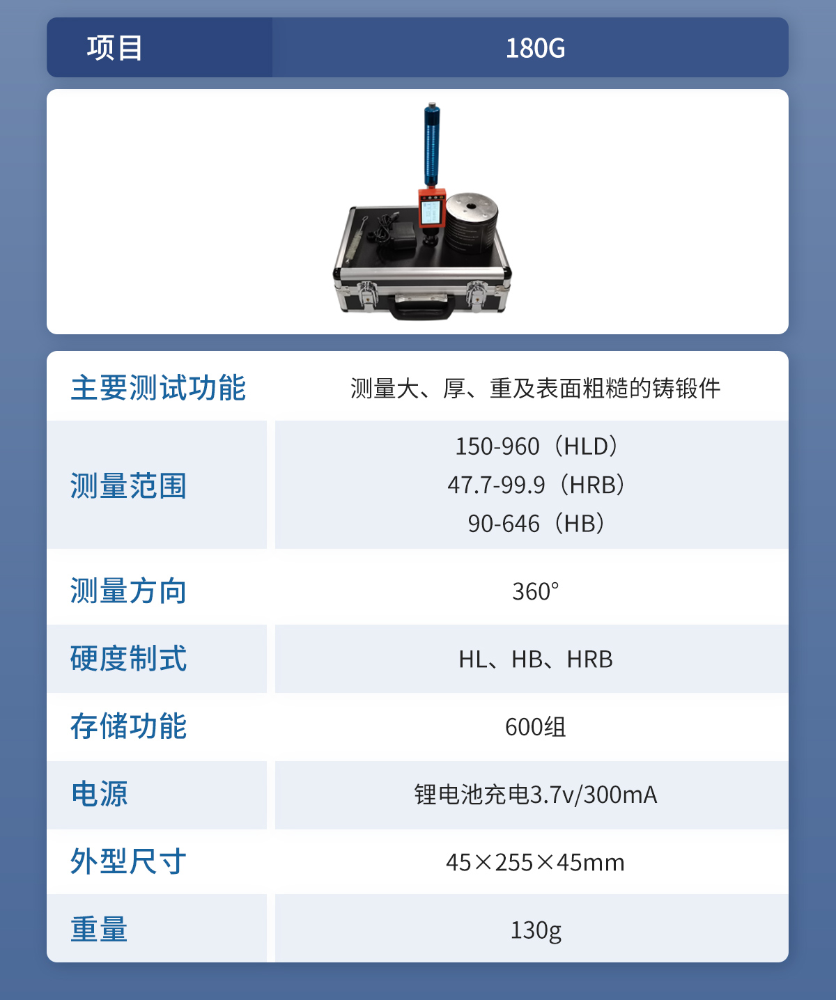 | 标准配置 | 主机、支撑环,HRC标准硬度块、充电器、尼龙刷 |