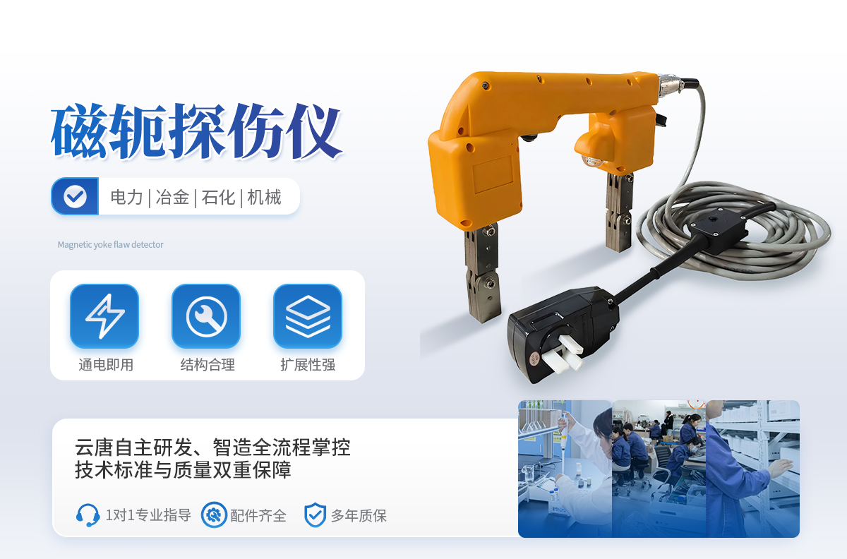 该仪器磁化电源具有电池电量显示功能,方便用户观察电池电量并及时充电。电磁轭采用高导磁芯、一体化线圈,重量轻,使用寿命长。采用高能锂电池供电,电池电量大,使用时间长,特别适合高空作业、锅炉、压力容器内部结构的磁粉探伤,解决了现场无电源的麻烦,提高了工作时的安全系数,降低工作人员的劳动强度。仪器符合JB/T7411-2012《电磁轭磁粉探伤仪技术条件》标准要求。