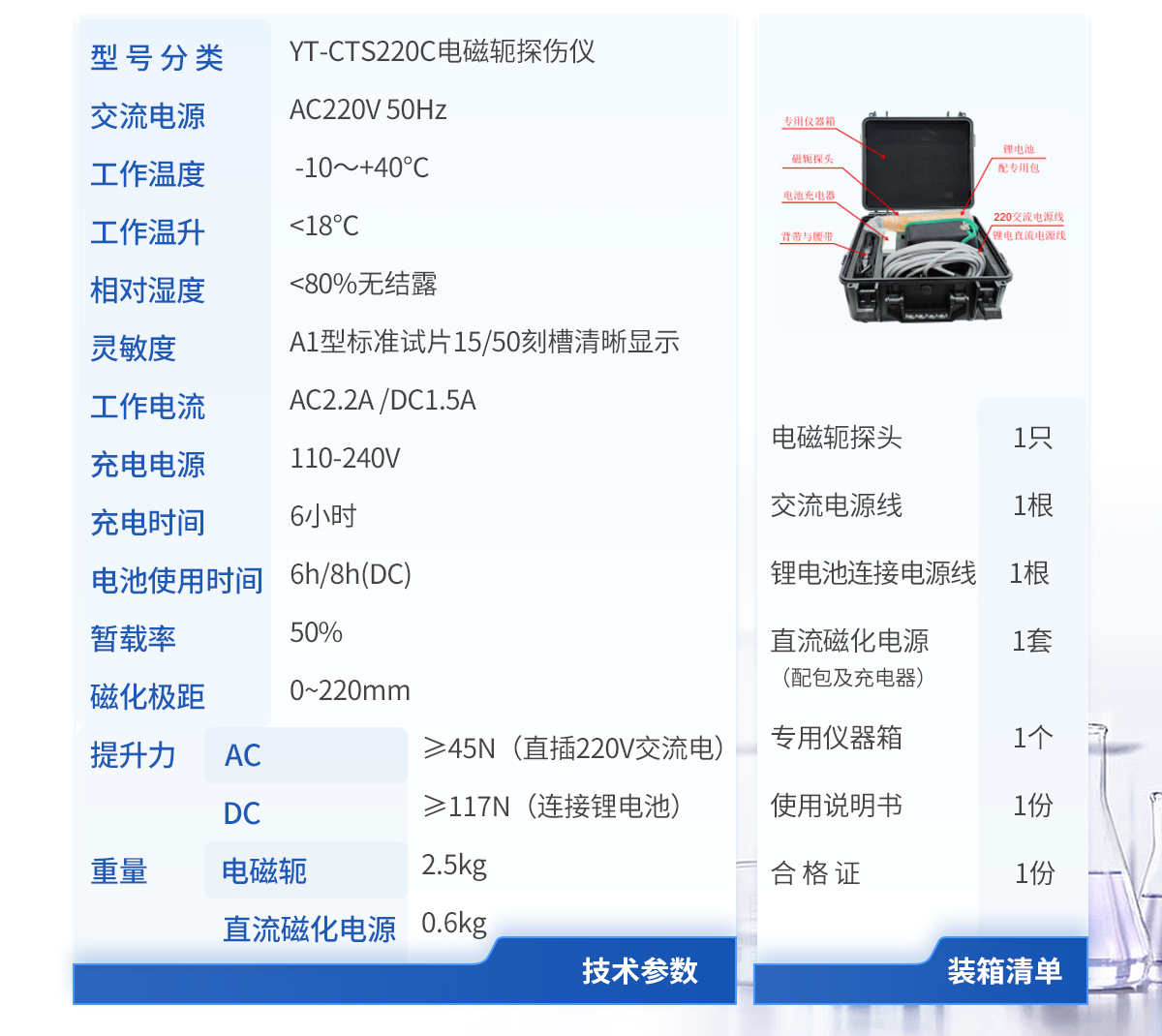 | 型 号 分 类:YT-CTS220C电磁轭探伤仪 | 交流电源:AC220V 50Hz | 工作温度:-10~+40℃ | 工作温升:<18℃> | 相对湿度:<80%无结露> | 灵敏度:A1型标准试片15/50刻槽清晰显示 | 工作电流:AC2.2A /DC1.5A | 充电电源:110-240V | 充电时间:6小时 | 电池使用时间:6h/8h(DC) | 暂载率:50% | 磁 化 极 距:0~220mm | 提升力:A C ≥45N(直插220V交流电) | 重量: (1)电磁轭:2.5kg (2)直流磁化电源(锂电池):0.6kg |