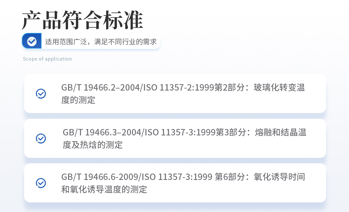 GB/T 19466.2–2004/ISO 11357-2:1999第2部分:玻璃化转变温度的测定 GB/T 19466.3–2004/ISO 11357-3:1999第3部分:熔融和结晶温度及热焓的测定 GB/T 19466.6-2009/ISO 11357-3:1999 第6部分:氧化诱导时间和氧化诱导温度的测定