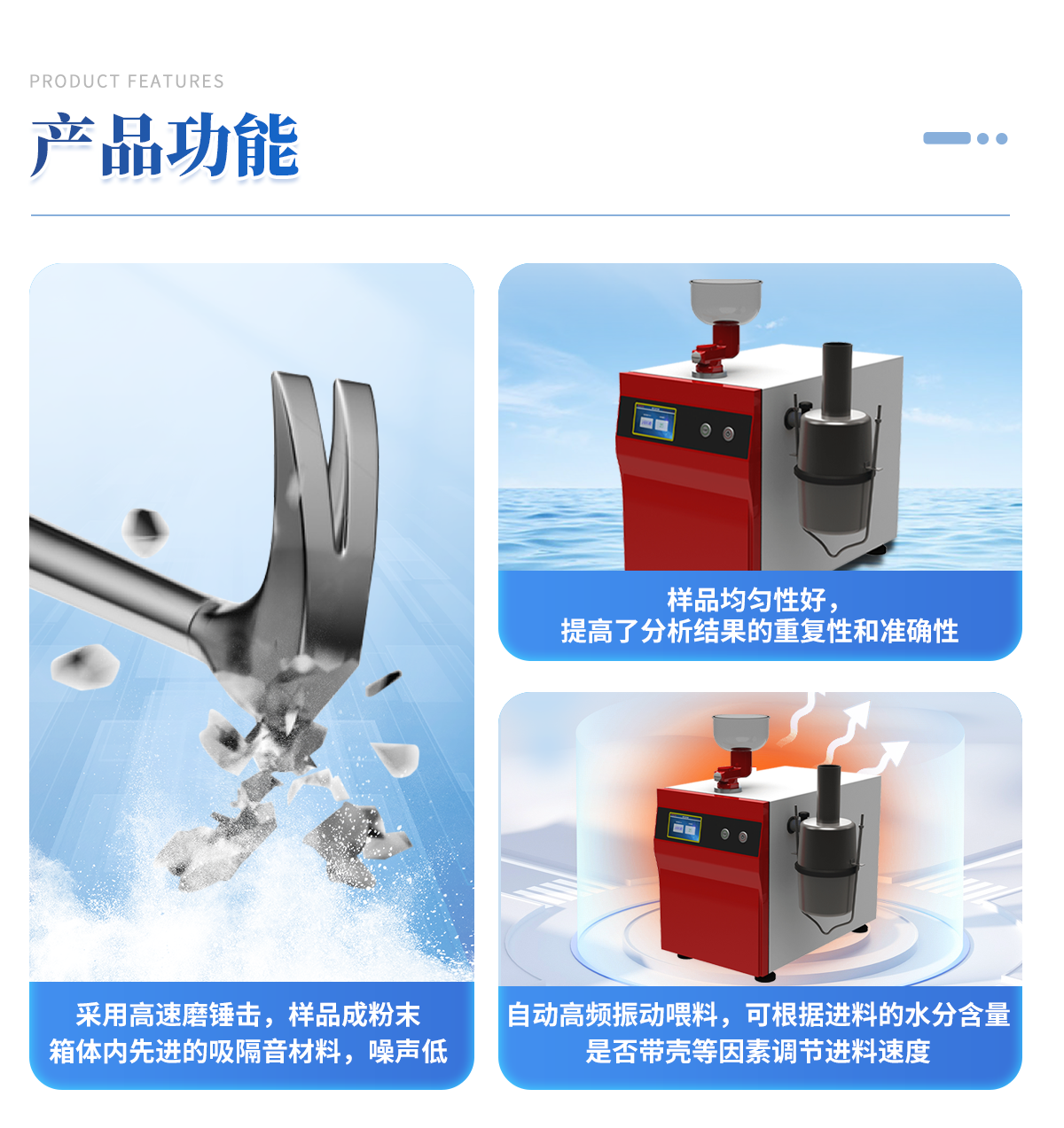 ·样品粉碎时具有高速气流自动清理磨膛功能,不需要在样品粉碎时停止进行人工清理