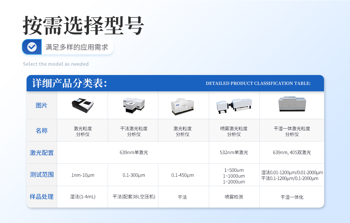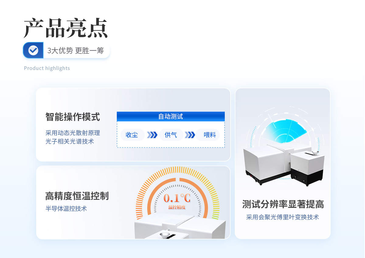 | 干湿一体化设计 本款仪器将湿法与干法测试集成于一体,成功解决了干湿法一体化的各项技术问题,能够实现干湿一键切换,使用快捷方便,是**颗粒测试、研究的**选择。 | 全内置分散系统 使用大功率循环泵,对管路进行优化设计,使整体控制协调性达到**水平,有效的防止了大颗粒的二次沉淀。 | 无约束自由拟合技术 运用无约束自由拟合技术,粒度分析不受任何函数的限制,可真实反映颗粒的分布状态。 | 光路设计 采用会聚光傅立叶变换技术,使散射光不受透镜孔径限制;采用双谱面光路设计,有效扩大测量范围至2000微米;双激光正交光路使用半导体辅助激光器测量侧向散射0.0155度至164度,将测量范围进一步扩展。 |