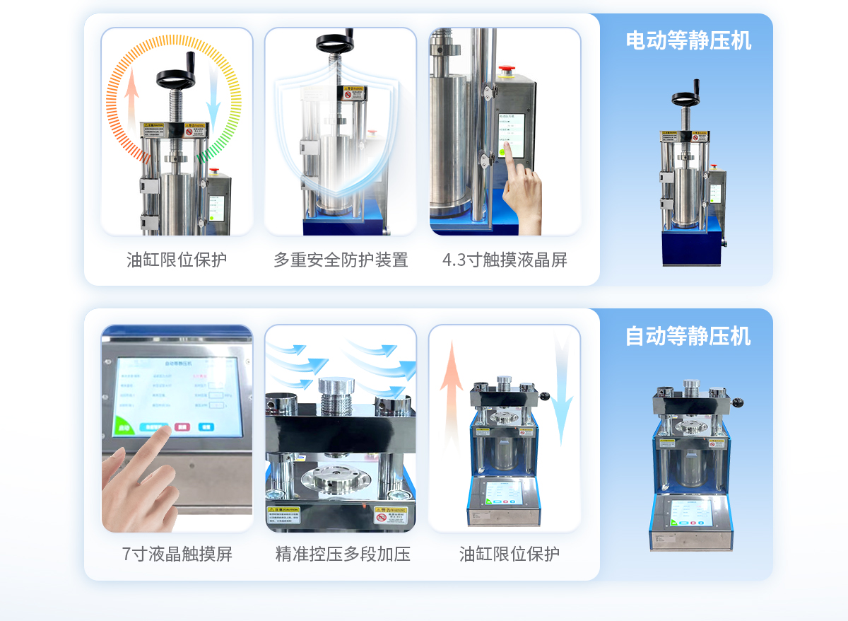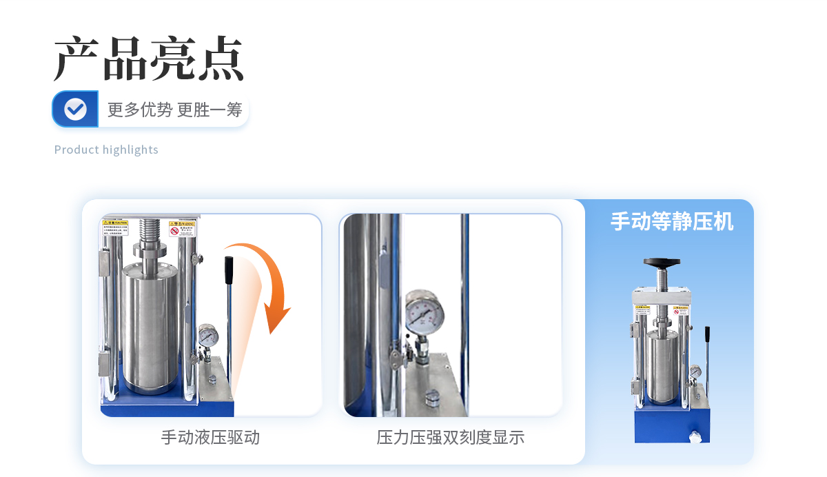 该机采用电动液压驱动,分体式结构,智能化的程序控制系统,安全可靠的防护装置,制样完毕可轻松拖动等静压腔体至取样平台,其操作简便,取样方便,适合需要大吨位、大物件样品的等静压实验。