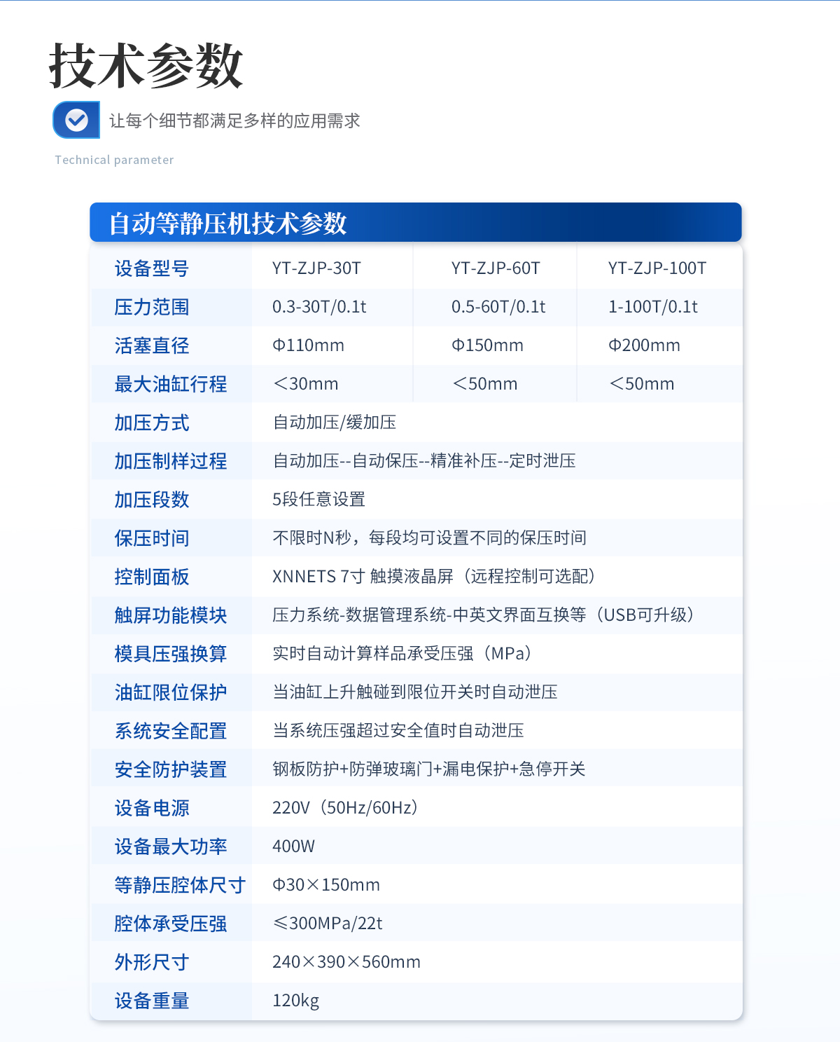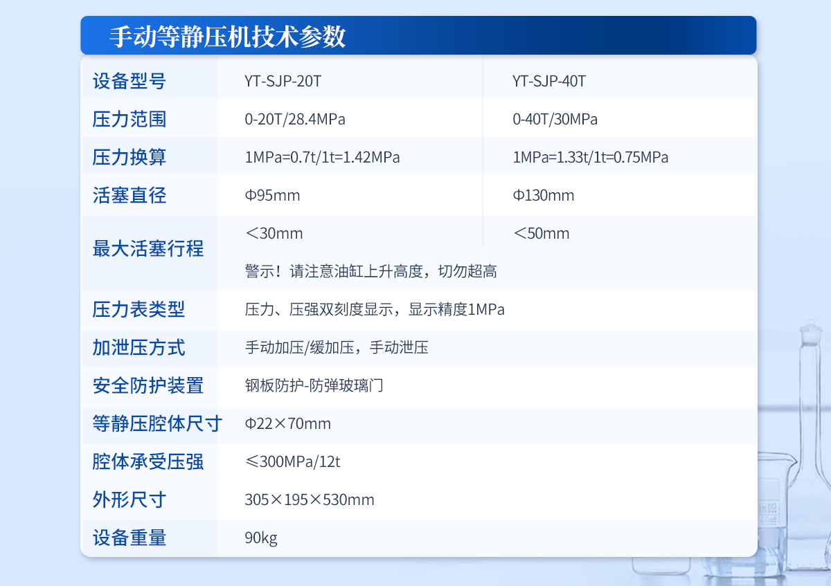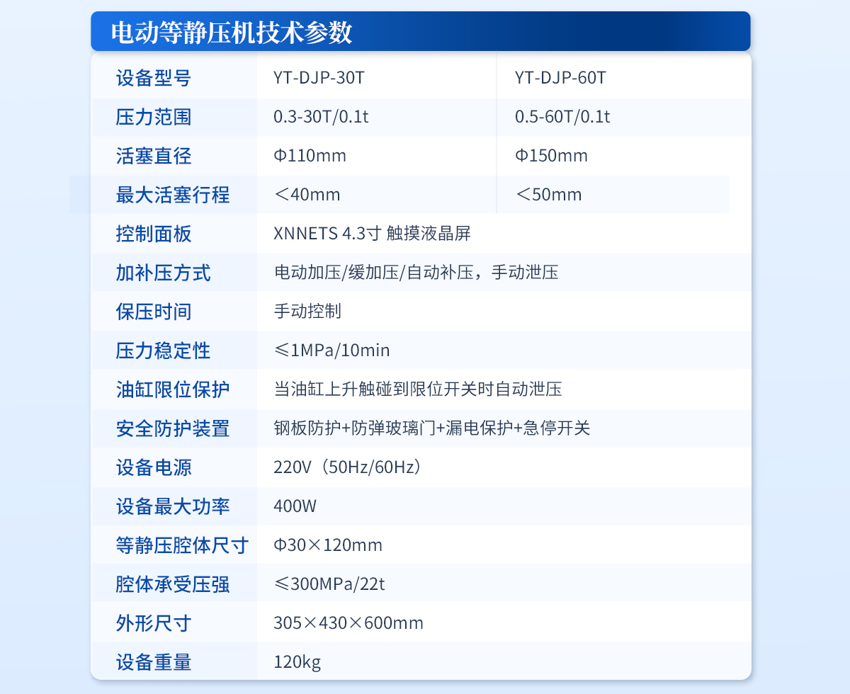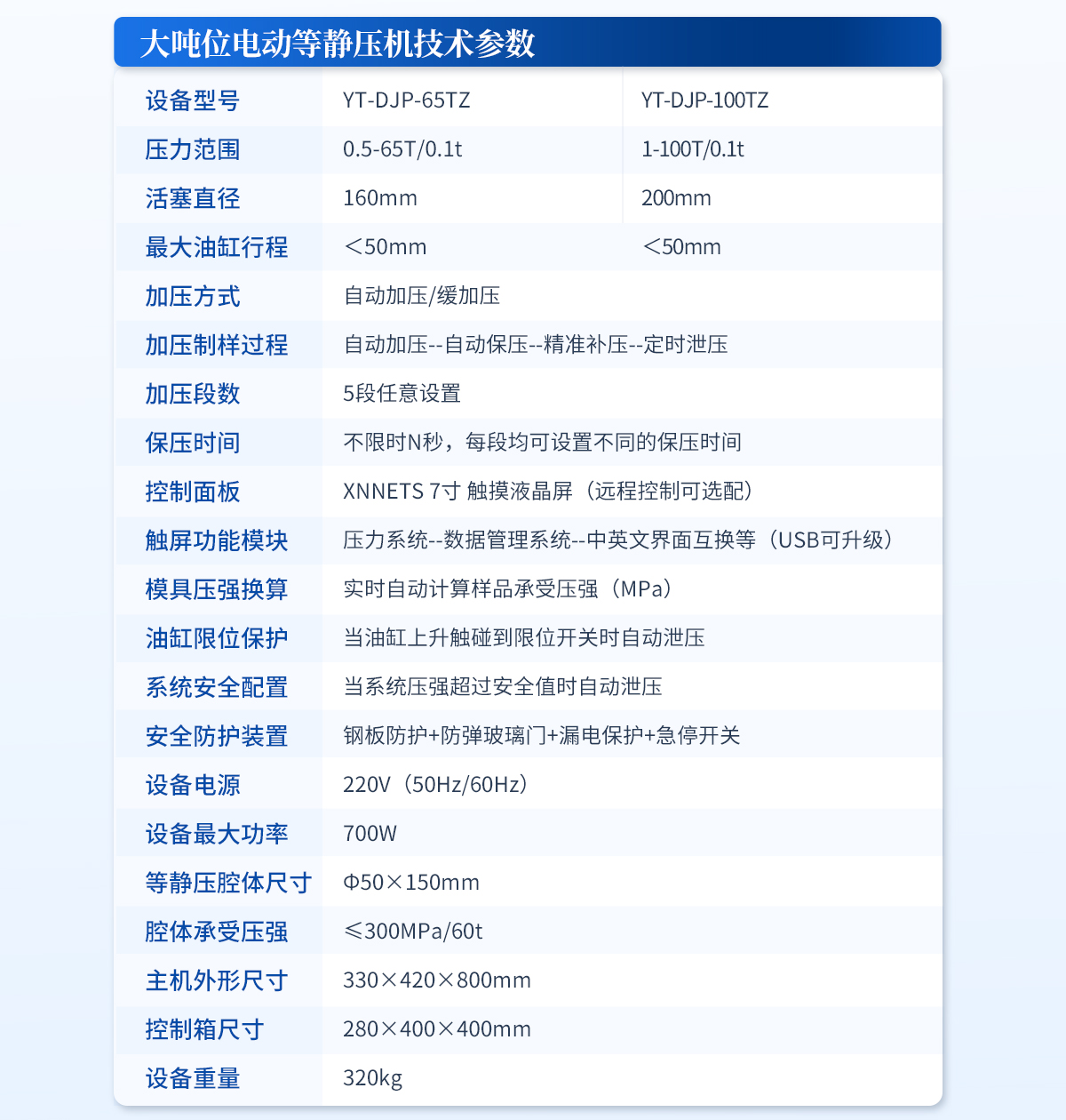 | 规格型号:YT-DJP-100TZ | 压力范围:1-100T/0.1t | 活塞直径 :200mm | **油缸行程:<50mm | 加压方式:自动加压/缓加压 | 加压制样过程:自动加压--自动保压--精准补压--定时泄压 | 加压段数:5段任意设置 | 保压时间 :不限时N秒,每段均可设置不同的保压时间 | 控制面板:XNNETS 7寸 触摸液晶屏(远程控制可选配) | 触屏功能模块:压力系统-数据管理系统--中英文界面互换等(USB可升级) | 模具压强换算:实时自动计算样品承受压强(MPa) | 油缸限位保护:当油缸上升触碰到限位开关时自动泄压 | 系统安全配置:当系统压强超过安全值时自动泄压 | 安全防护装置:钢板防护+防弹玻璃门+漏电保护+急停开关 | 设备电源:220V(50Hz/60Hz) | 设备**功率:700W | 等静压腔体尺寸:Φ60×150mm | 腔体承受压强:≤300MPa/87t | 主机外形尺寸:380×520×950mm | 控制箱尺寸:350×500×480mm | 设备重量 :510kg | 配置说明:主机1台,控制箱1台,等静压腔体1套!可根据需求定制500MPa等静压机或橡胶模具 |