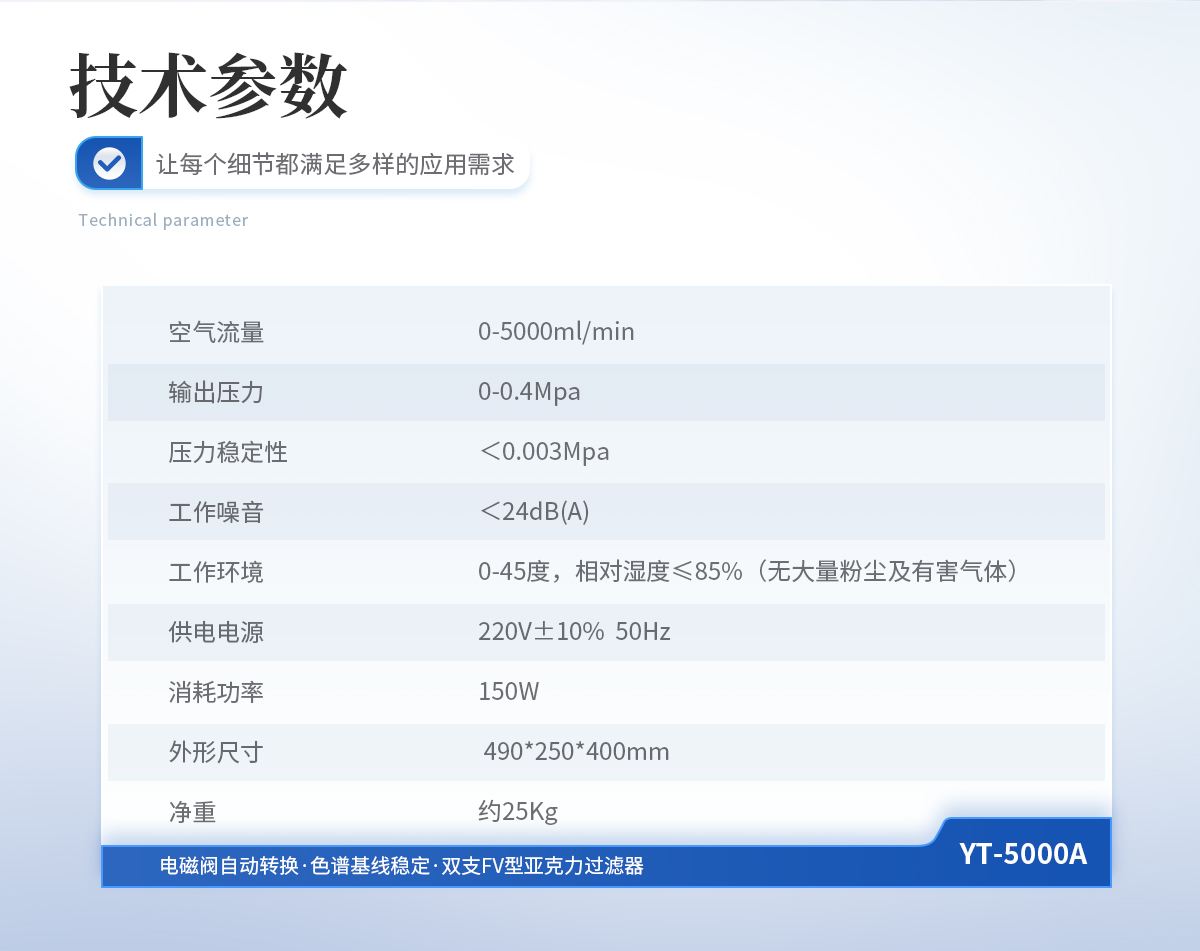 1、空气流量: 0-5000ml/min    2、输出压力: 0-0.4Mpa    3、压力稳定性:<0.003Mpa    4、工作噪音: <24dB(A)    5、工作环境: 0-45度,相对湿度≤85%(无大量粉尘及有害气体)    6、供电电源: 220V±10% 50Hz    7、消耗功率: 150W    8、外形尺寸: 490*250*400mm    9、净重: 约25Kg