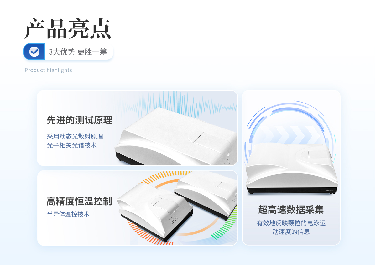 双波长激光器,全自动切换 独家采用双波长(λ= 405nm、λ= 532nm)激光器搭建而成的光路系统,相关谱探测系统不仅体积小,而且具有很强的抗干扰能力,从而保证了测试的稳定性;对某些具有吸光属性,传统单一波长激光器无法检测的样品,可进行有效检测;**的测试原理 采用动态光散射原理和光子相关光谱技术,根据颗粒在液体中的布朗运动速度测定颗粒大小。大小颗粒运动速度不同,激光照射这些颗粒,不同大小的颗粒将使散射光发生快慢不同的涨落起伏。光子相关光谱法就根据特定方向的光子涨落起伏分析其颗粒大小。超高速数据采集 使用PCS技术测定纳米级颗粒大小,必须能够分辨纳秒级信号起伏。本仪器的核心部件采用我公司研制的CR256数字相关器,具有识别8ns的**分辨能力和**的信号处理速度,其数据处理速度高达162M。它能实时完成动态散射光强的采集和自相关函数运算,从而有效地反映不同大小颗粒的动态分光散射信息,为测试结果的准确性典型基础。高灵敏度和信噪比 采用专业级高性能光电倍增管,对光子信号具有**的灵敏度和信噪比。高精度双温控保护系统 采用半导体温控技术,样品池温控系统和激光器温控系统精度高达±0.1℃,使被测样品和激光器光源在整个测试过程中都处于恒温状态,避免温度变化对不测试结果的影响,确保测试准确和重复;稳定的光路系统 采用光纤技术搭建而成的光路系统,使光子相关谱探测系统不仅体积小,而且具有很强的抗干扰能力,从而保证了测试的稳定性。
