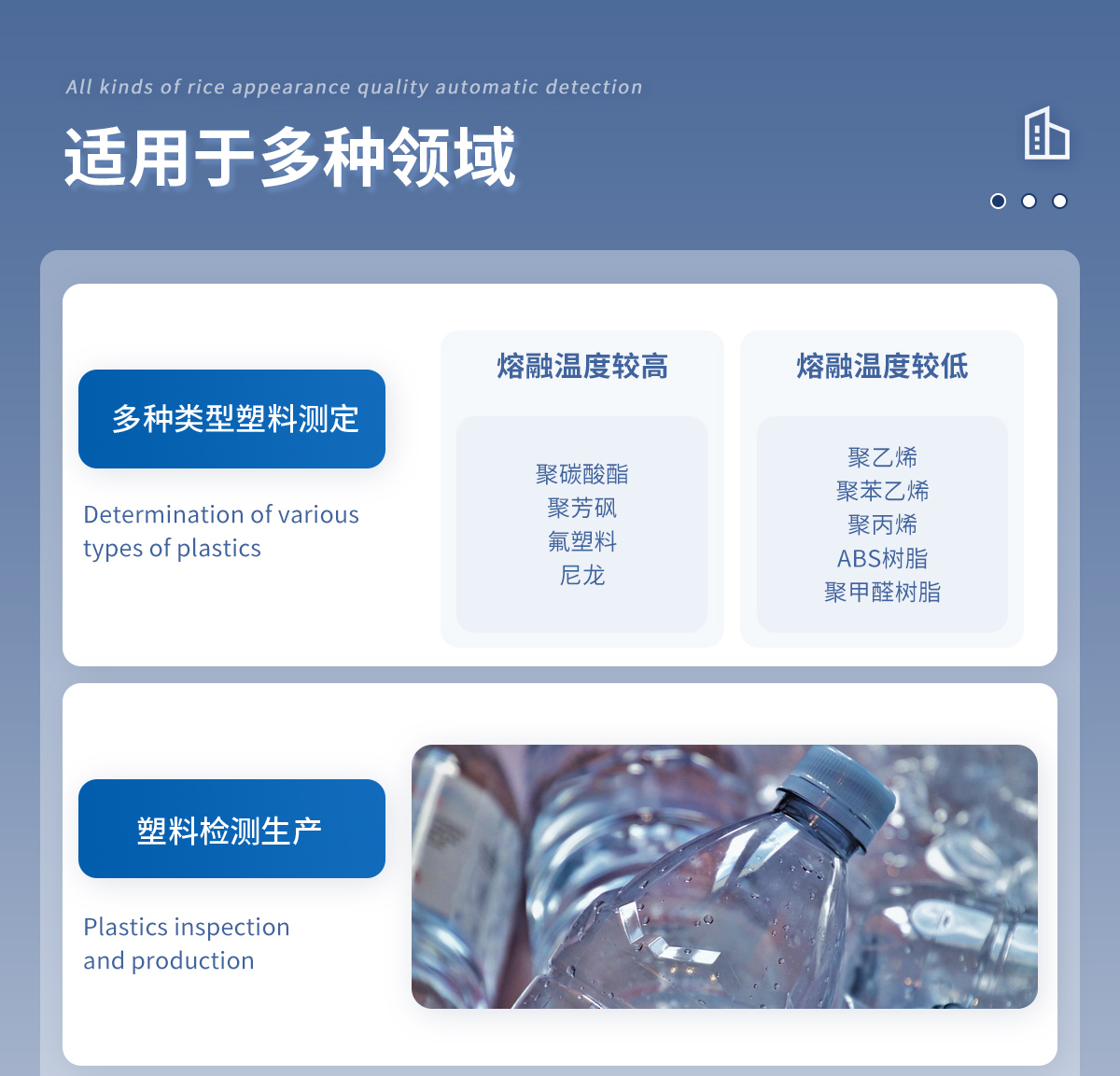 本仪器是用来测定各种高聚物在粘流状态时熔体流动速率,它既适用于熔融温度较高的聚碳酸酯、聚芳砜、氟塑料、尼龙等工程塑料,也适用聚乙烯、聚苯乙烯、聚丙烯、ABS树脂、聚甲醛树脂等熔融温度较低的塑料测试,广泛地应用于塑料生产、塑料制品、石油化工等行业以及有关院校、科研单位和商检部门。