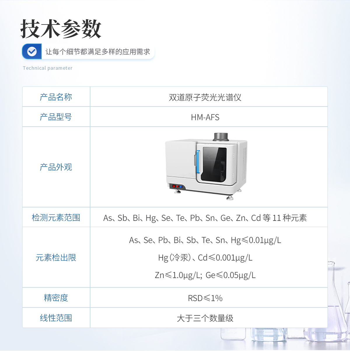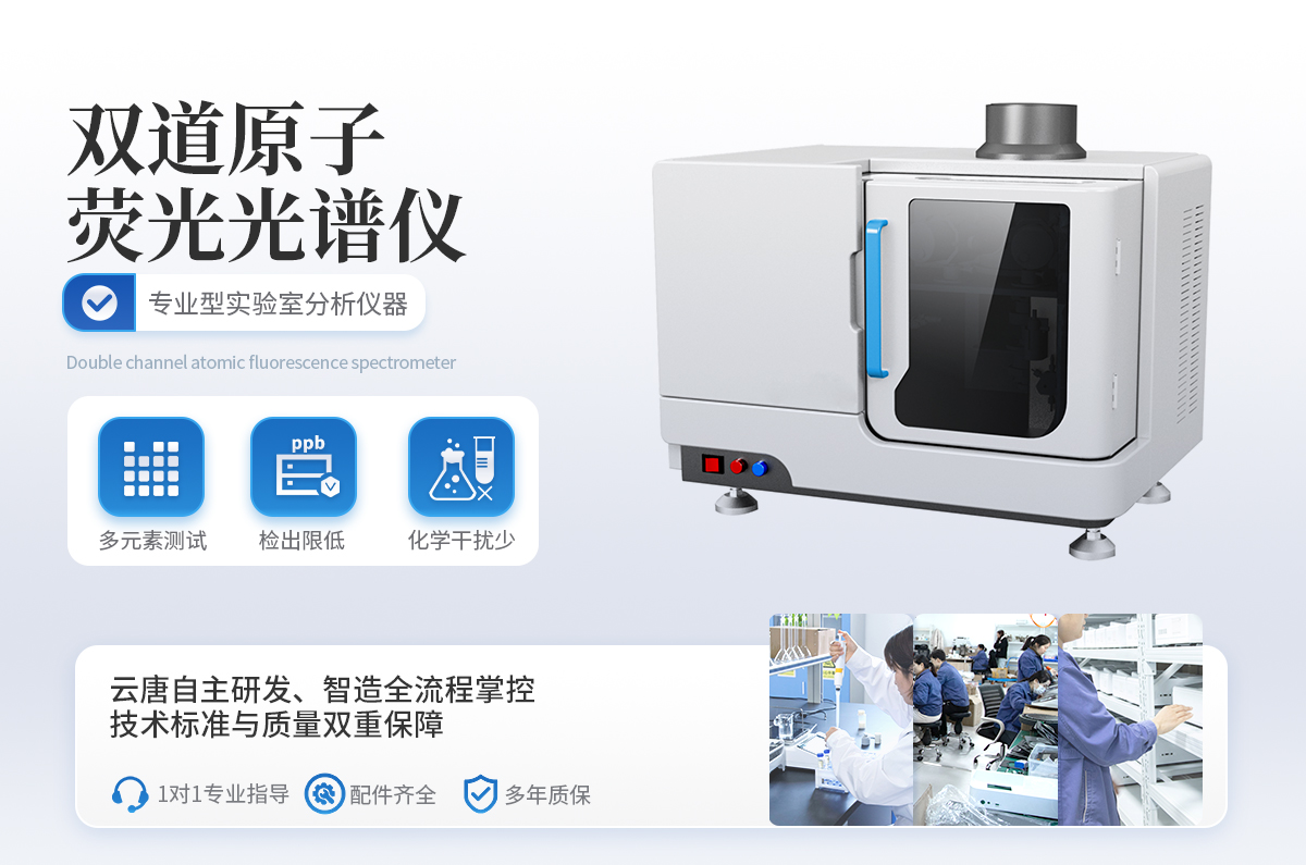 双道原子荧光光谱仪广泛应用于汞(Hg)、砷(As)、锑(Sb)、铋(Bi)、硒(Se)、碲(Te)、镉(Cd)、锗(Ge)、铅(Pb)、锡(Sn)、锌(Zn)等11 种元素的痕量、超痕量分析,体积小巧,性能稳定,操作简单。