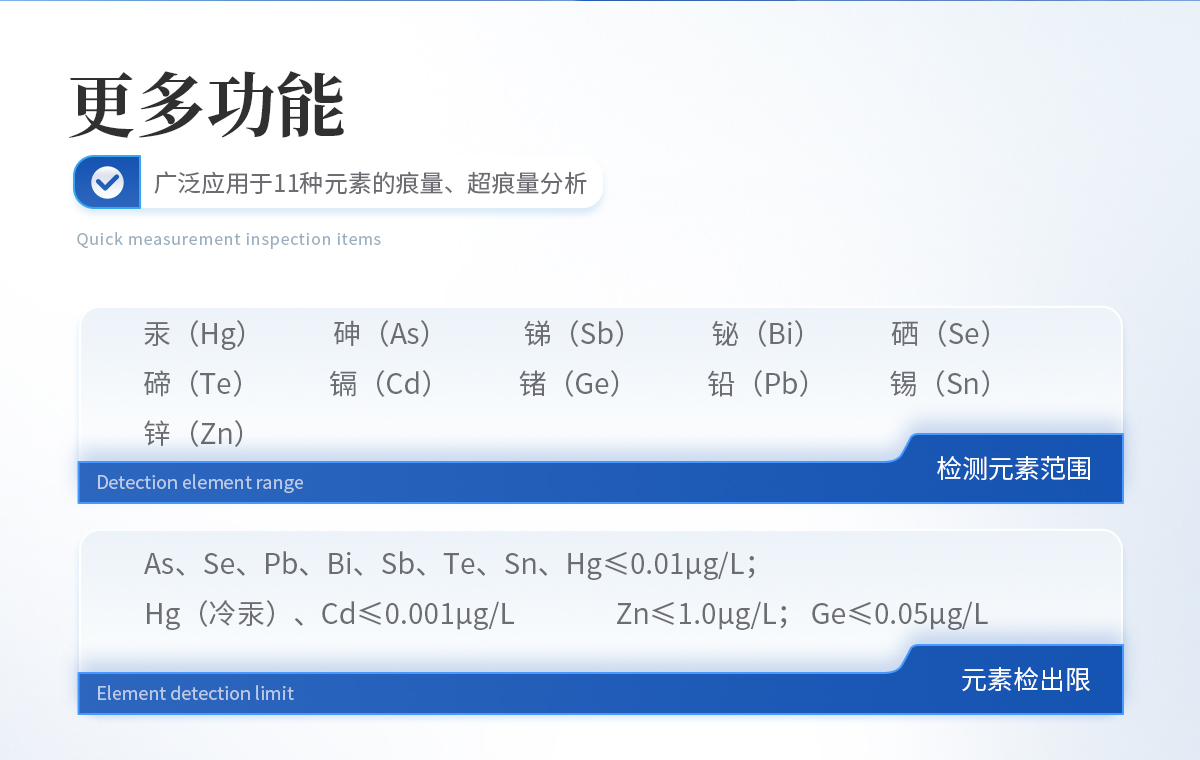 As、Sb、Bi、Hg、Se、Te、Pb、Sn、Ge、Zn、Cd 等 11 种元素。 2、元素检出限