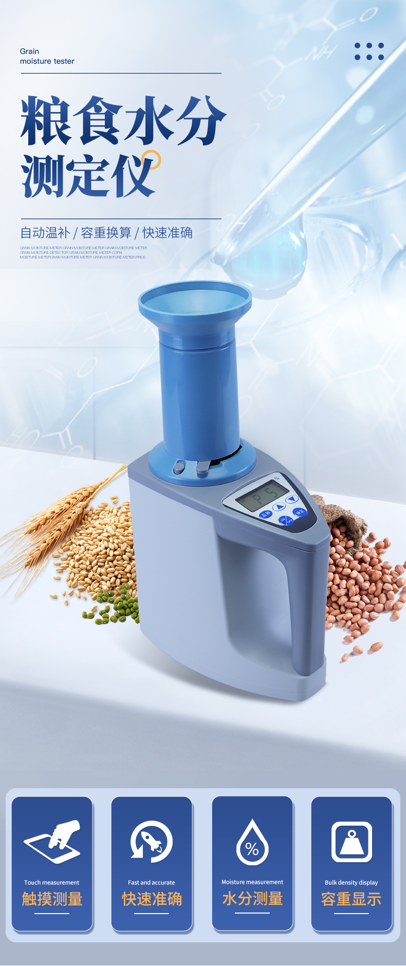 操作简单:20个常见品种已预先定标,不需秤样、用料简取样后可立即测量水分