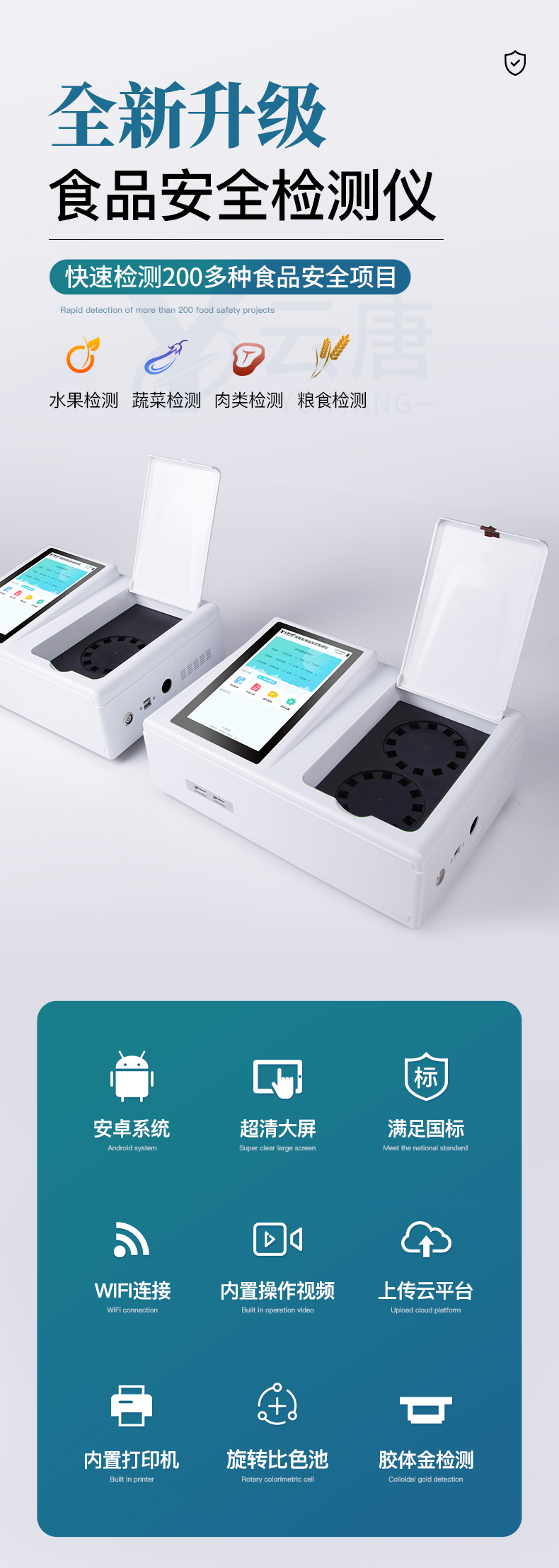 山东云唐智能科技有限公司生产的高智能食品安全检测仪为集成化食品安全快速检测分析设备,采用台式一体化设计,可快速检测200多种食品安全项目,包含非食用化学物质、滥用食品添加剂、农药残留、兽药残留、重金属、病害肉、营养强化剂、抗生素类残留、激素类残留、真菌毒素类残留、化学类残留等项目的定性定量检测。