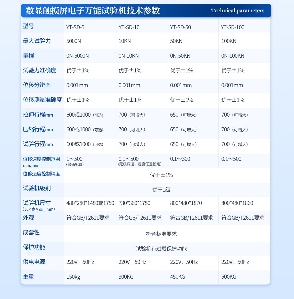 | 1、采用高精度、全数字调速系统及精密减速机,驱动精密丝杠副进行试验,实现试验速度的大范围调节,试验过程噪音低、运行平稳。 | 2、万向节采用十字插销结构,而且具有摆角限制功能,一方面便于试样夹持,保证试验同心度,另一方面很好的消除了不规则试样对传感器的影响。 | 3、触摸键操作方式,液晶显示器实时显示。显示界面可显示试验方法选择界面、试验参数选择界面、试验操作及结果显示界面和曲线显示界面,方便快捷。 | 4、可实现试样装夹时横梁快慢升降调整,具有过流、过压、过载等保护装置。 | 5、选配微机接口,可外接微机实现试验过程的控制及数据的存储、打印。 |