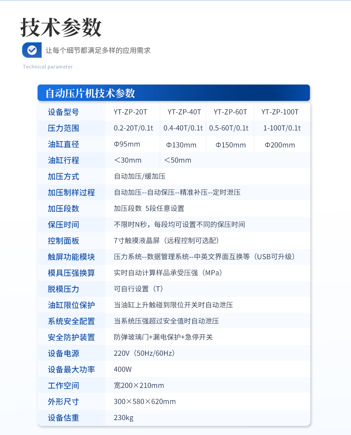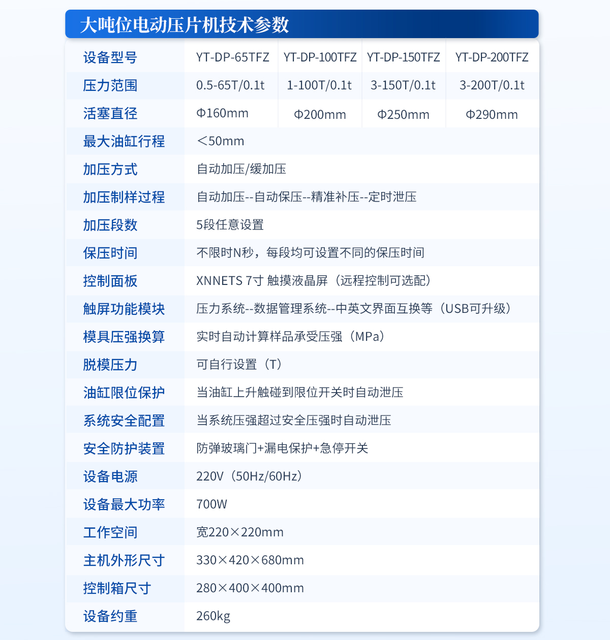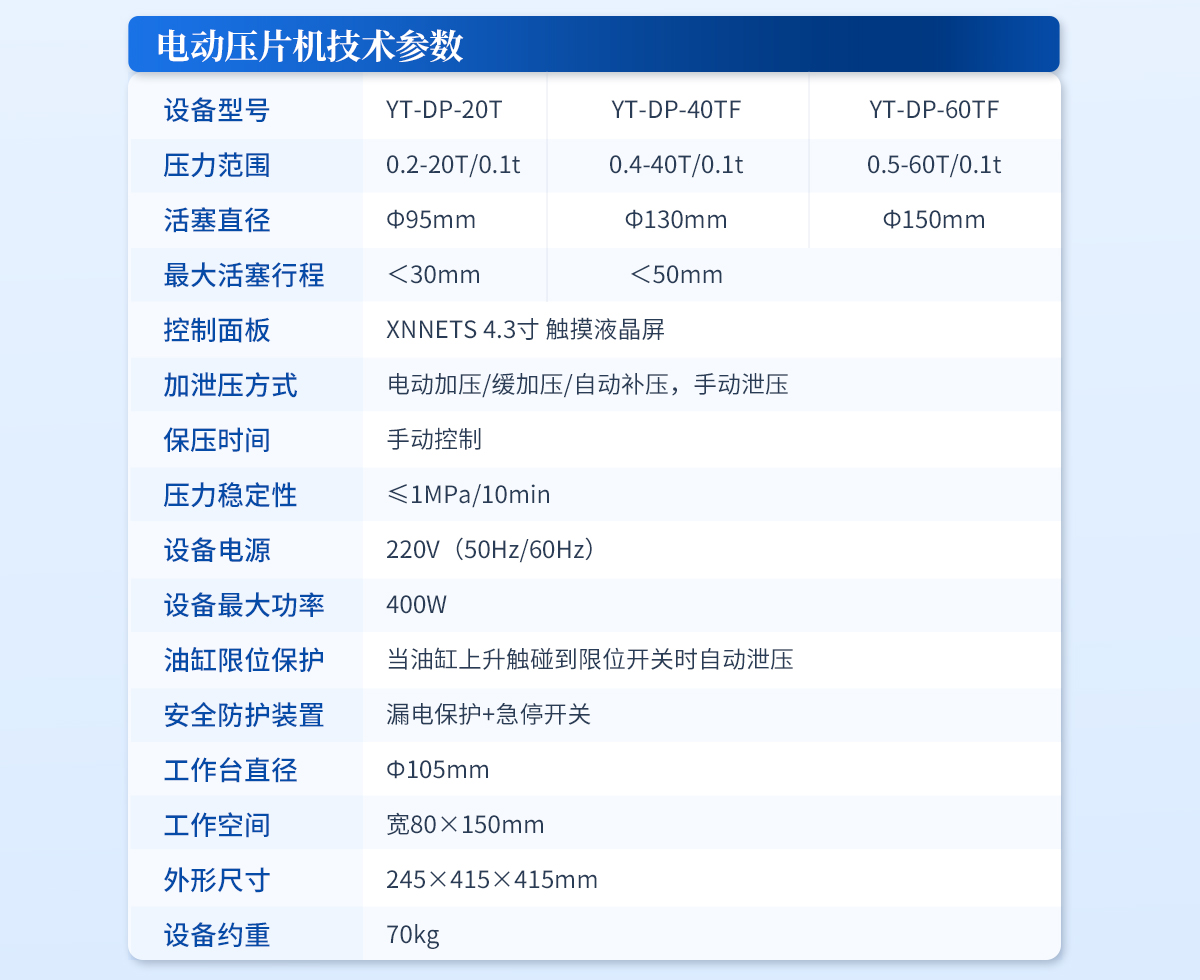 | 设备型号:YT-DP-200TFZ | 压力范围:3-200T/0.1t | 油缸直径:Φ290mm | 油缸行程 :<50mm | 加压方式:自动加压/缓加压 | 加压制样过程:自动加压--自动保压--精准补压--定时泄压 | 加压段数:5段任意设置 | 保压时间:不限时N秒,每段均可设置不同的保压时间 | 控制面板:XNNETS 7寸 触摸液晶屏(远程控制可选配) | 触屏功能模块:压力系统--数据管理系统--中英文界面互换等(USB可升级) | 模具压强换算:实时自动计算样品承受压强(MPa) | 脱模压力:可自行设置(T) | 油缸限位保护:当油缸上升触碰到限位开关时自动泄压 | 系统安全配置:当系统压强超过安全值时自动泄压 | 安全防护装置:防弹玻璃门+漏电保护+急停开关 | 设备电源:220V(50Hz/60Hz) | 设备**功率:700W | 工作空间:宽350×300mm | 主机外形尺寸:480×600×1050mm | 控制箱尺寸:350×500×480mm | 设备约重 :780kg | 配置说明:主机1台,控制箱1台!模具选配!可根据需求定制压片机或模具 |